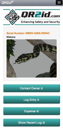 Logging important information for applications such as vehicle tax records, the care of wildlife, and equipment maintenance couldn't be easier with a QR2id Sticker or Plate. Simply scan the QR2id Code and touch the Log Entry button to bring up the form. QR2id remembers any special types of observations applicable and has them ready for you next time. e.g. Your last travel destination or some characteristic of in an animal care log, such as 'Snake Sheds'.