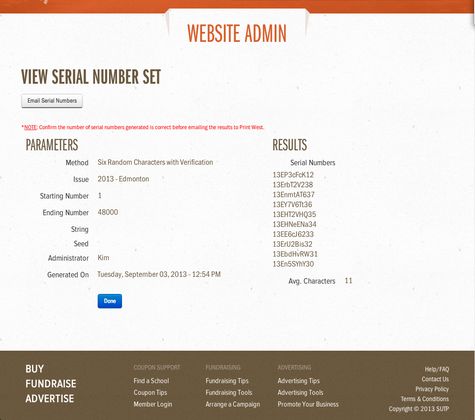 File manipulation - time-stamped PDF coupons for download, spreadsheet-based report generation, coupon artwork and coupon proof/final upload