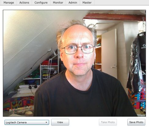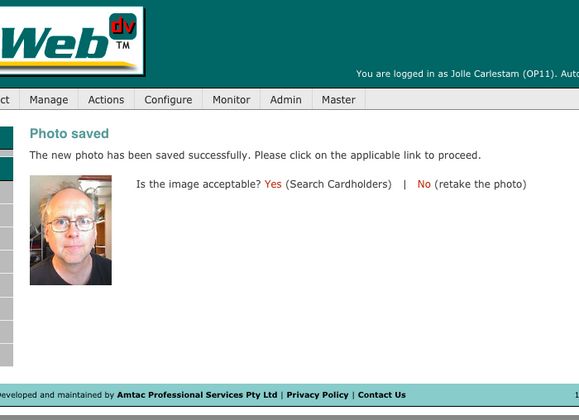 Start screen allows operator to pick a connected webcam and take a photo to be used for an ID card. Any internet connected computer can be used and it's possible to use several workstations at the same time.