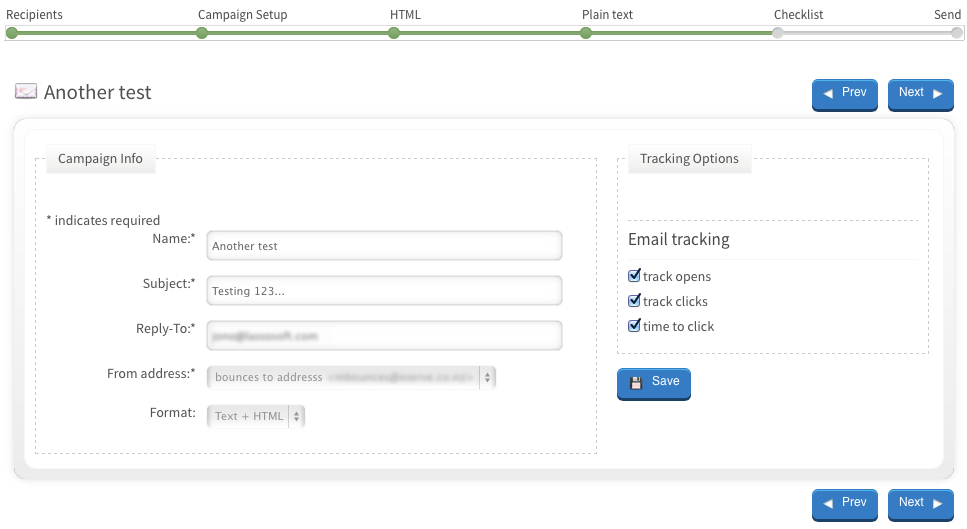 Under the main Campaigns tab, select the tab marked “New Campaign”. You will be brought to the campaign setup window. This window presents a kind of timeline across the top, offering you the sequence of the steps needed to create your campaign properly. You can skip ahead or go back to any point in the timeline if you wish by clicking on the name of the setup set eg ‘HTML’, or ‘Checklist’