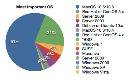 Based on analyzing the survey results (thanks Rachel), we have also been able to draw conclusions about who is developing on what platform. Here are the results;