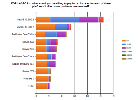 This information also affects pricing (which I will discuss soon). Should we charge $20k per license, then we will be getting return on our investment for each OS we do a release for which is purchased. I strongly believe the market will not bear this price (hehe - though it has been suggested by an external consultant). The current standing price for Lasso is probably about right. (More to come on this in a later blog). This becomes even more obvious when we look at the facts of what people are willing to pay;